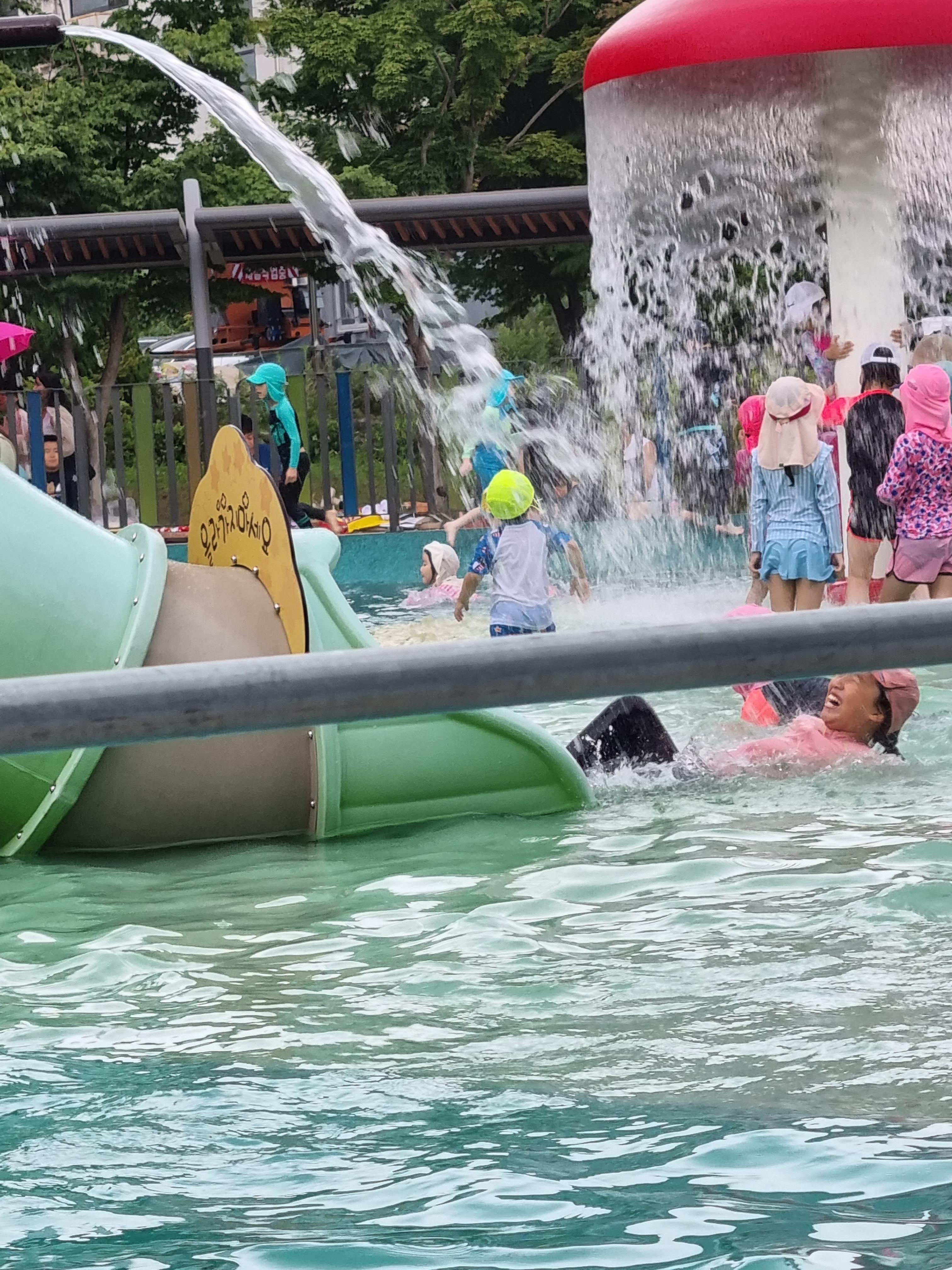 물이 폭포수처럼 나와 신나게 노느라 정신없는 아이들